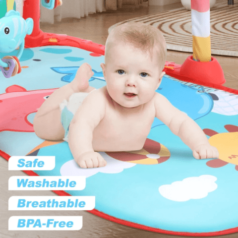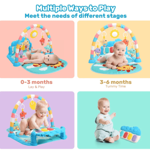 Salteluța se adaptează vârstei copilului: joacă pe spate (0-3 luni), stat pe burtică (3-6 luni), apăsat și explorat (6-9 luni), pian detașabil (9+ luni).