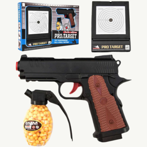 Pistolul de jucărie este proiectat să funcționeze cu bile de mici dimensiuni, fiind ușor de manevrat și oferind o experiență realistă.