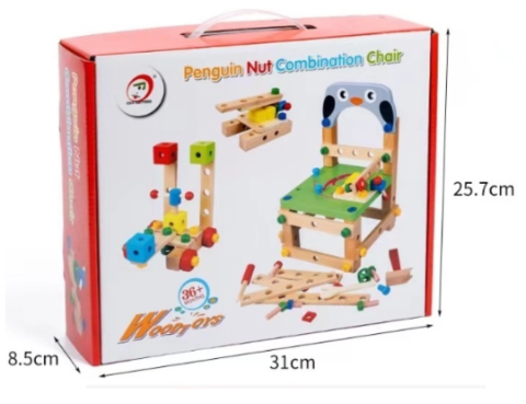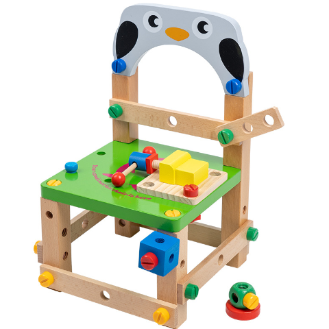 Copiii pot construi scaunul cu design simpatic de pinguin, folosind șuruburi, chei și șurubelnițe incluse în set, dezvoltându-și îndemânarea și coordonarea mână-ochi.