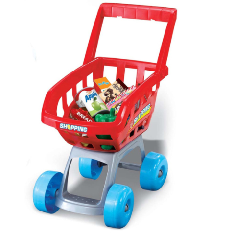 Coșul de cumpărături inclus este perfect pentru a transporta alimentele, iar setul de bani și carduri adaugă o notă autentică.