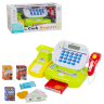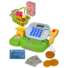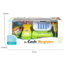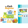 Setul include o casă de marcat cu sunete și lumini, un coș de cumpărături cu fructe, bani de jucărie și un card bancar.