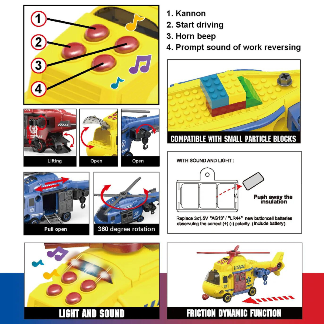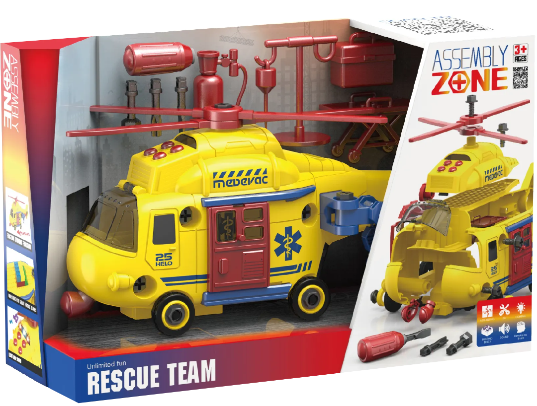Setul include un elicopter detașabil care se poate asambla și accesorii esențiale pentru misiuni de salvare, precum o targă, un extinctor și un kit de prim ajutor.
