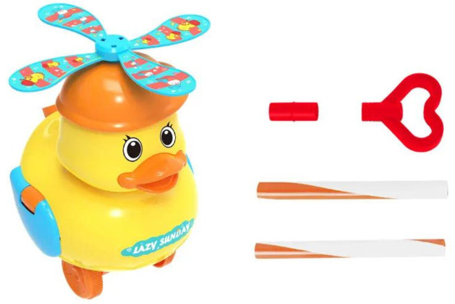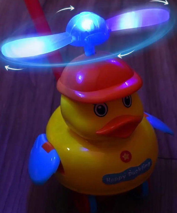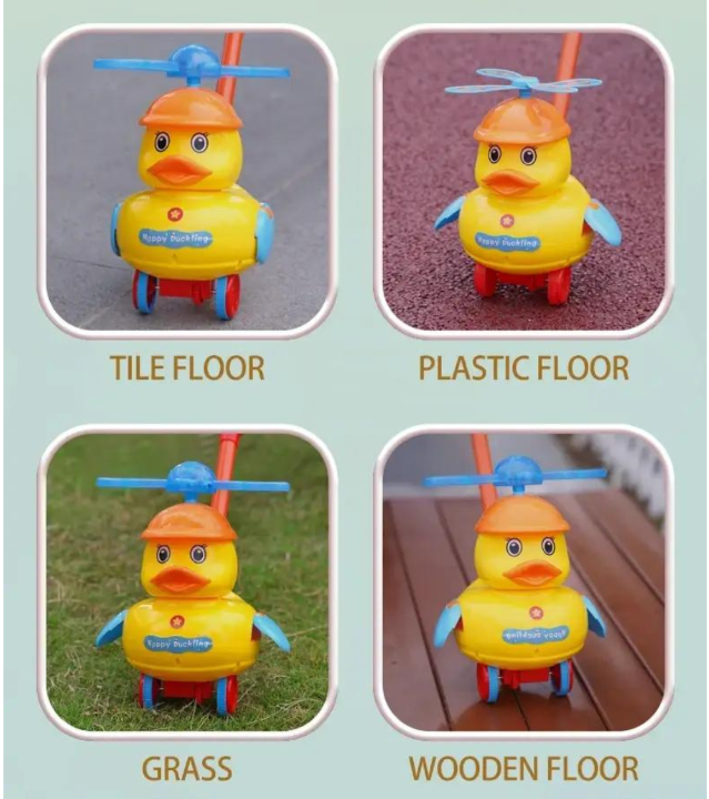 Cu un mâner special pentru a putea fi împinsă, rățușca emite sunete și are elicea deasupra capului care se învârte atunci când este deplasată.
