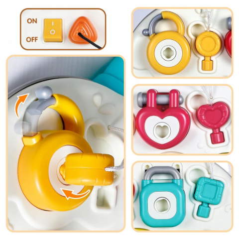 Sistemul de încuietori și chei colorate îi ajută pe copii să descopere potrivirea formelor și să își îmbunătățească dexteritatea.