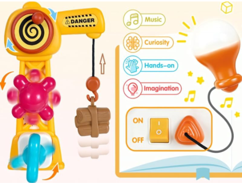 Butonul de aprindere a becului și efectele sonore transformă activitatea într-o experiență senzorială, captivând atenția celor mici.