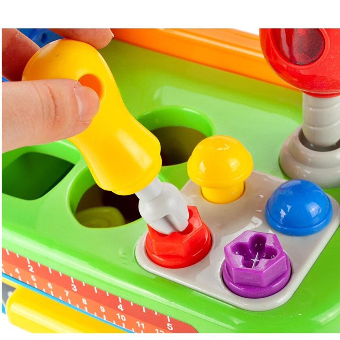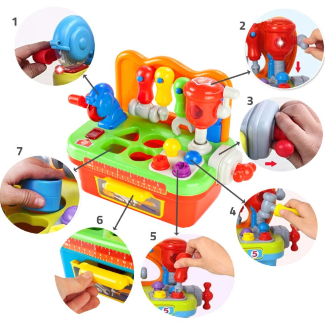 Setul include ciocan, șurubelniță, ferăstrău și alte accesorii distractive care imită sunetele reale ale uneltelor.