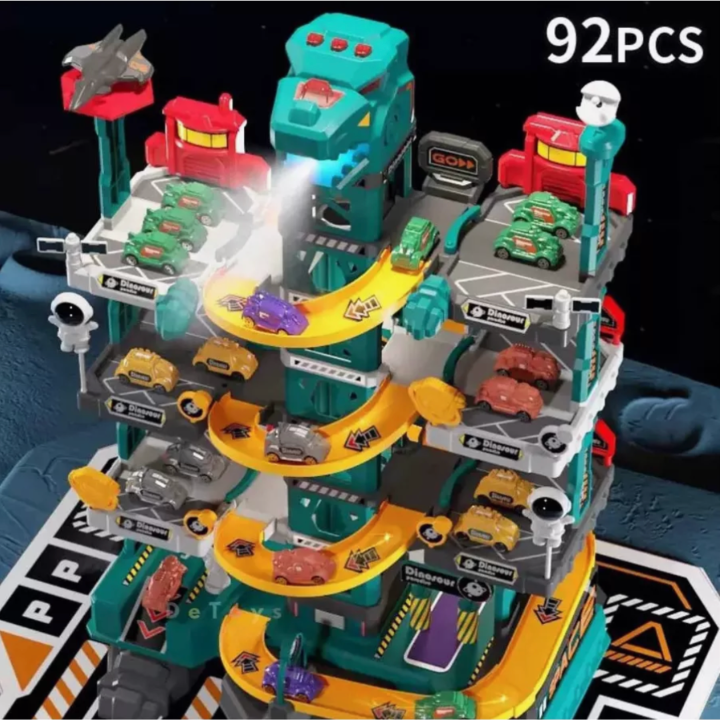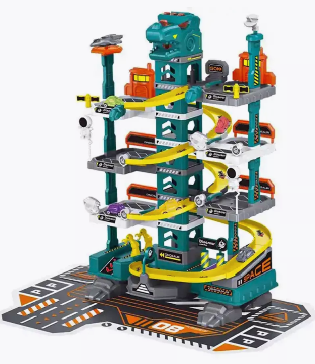 Cu dimensiunile impresionante de 62 cm înălțime, 39 cm lățime și 28 cm adâncime, garajul este dotat cu un lift electric care transportă mașinuțele pe șase etaje pline de aventuri.
