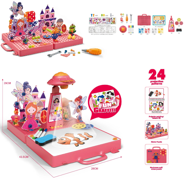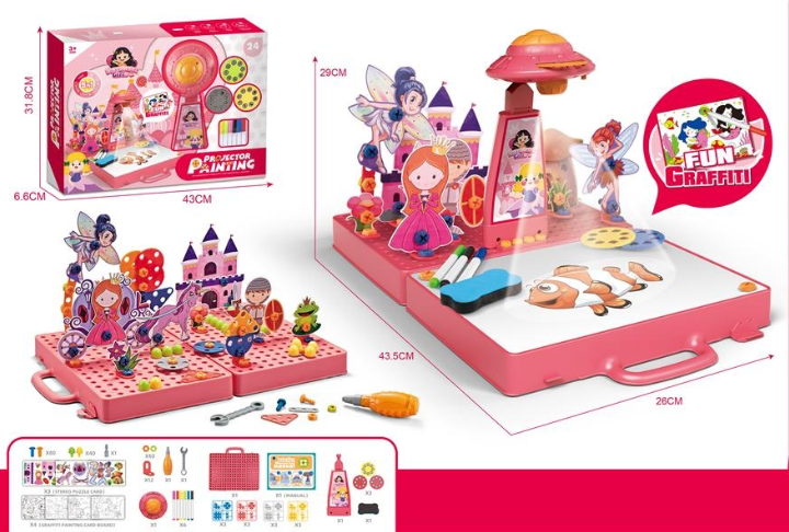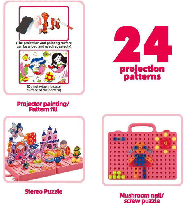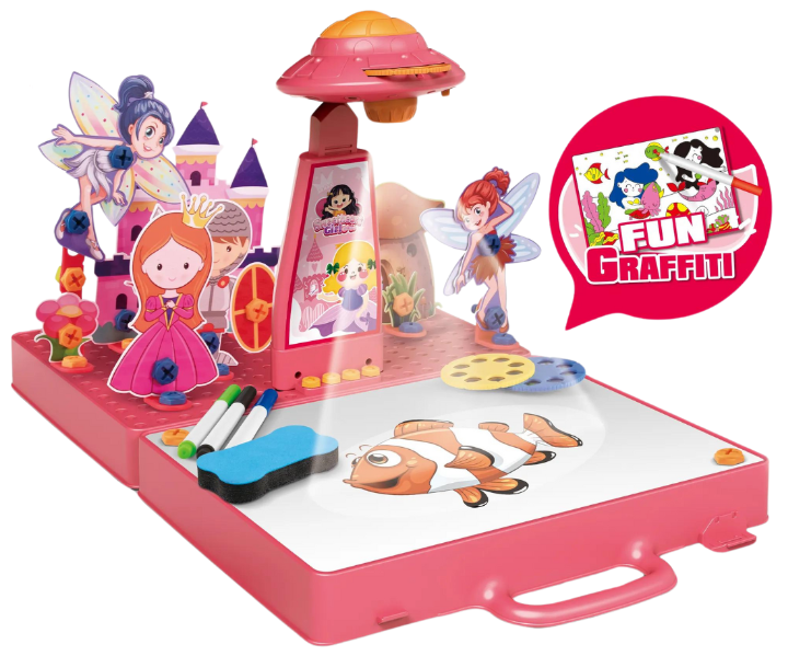 Proiectorul cu 24 de modele permite copiilor să proiecteze și să traseze desene, în timp ce piesele tridimensionale și accesoriile de construcție stimulează imaginația și creativitatea.