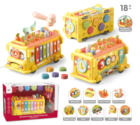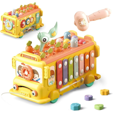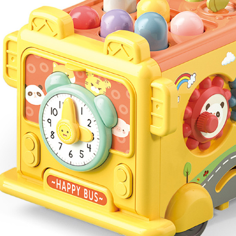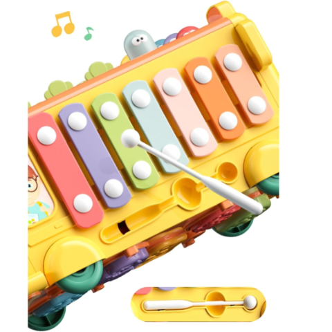 Lateralul autobuzului include un xilofon colorat care transformă momentele de joacă într-o experiență muzicală plină de veselie.