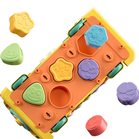 Partea inferioară a jucăriei este dedicată potrivirii formelor, ajutând copiii să învețe culorile și conceptele spațiale.