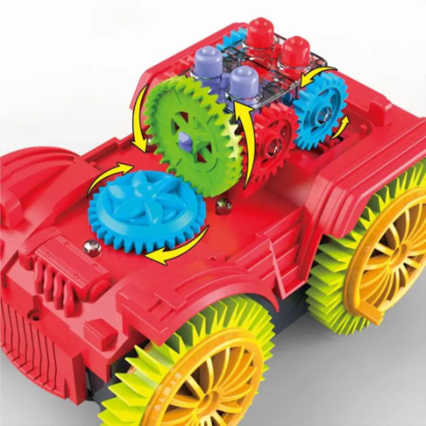 Designul său transparent permite copiilor să vadă angrenajele colorate în acțiune, adăugând o notă educativă și distractivă fiecărui moment.