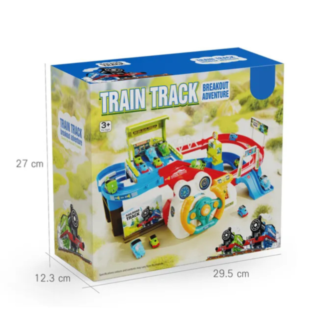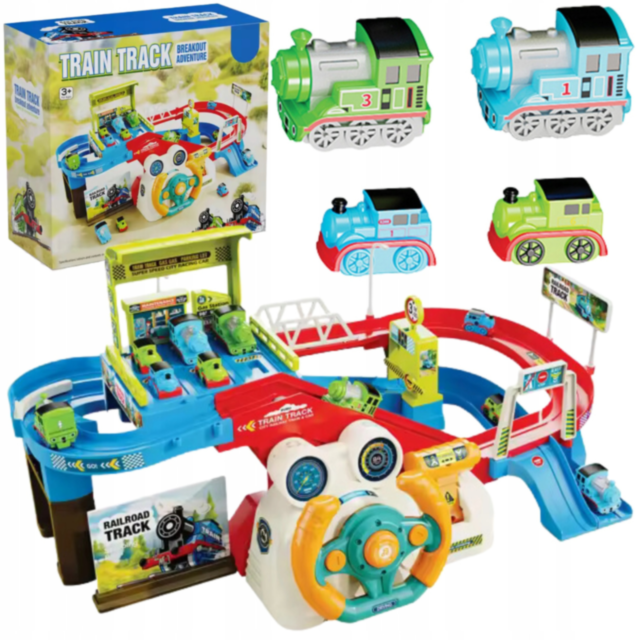 Cele patru trenulețe incluse vin în culori vesele, completând tematica feroviară într-un mod fascinant.