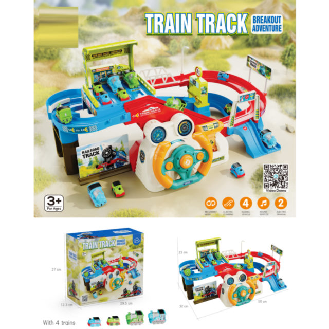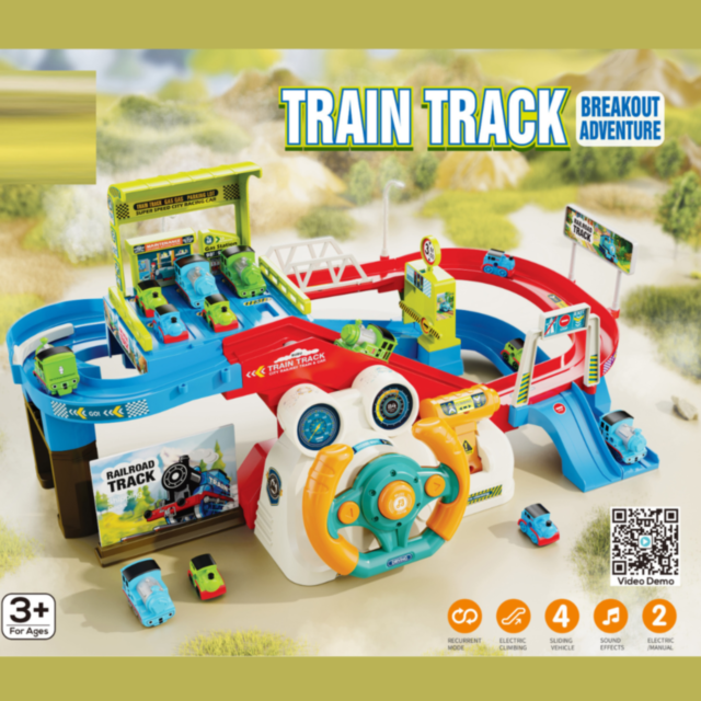 Descoperă un circuit interactiv care combină trenulețe și mașinuțe într-o aventură captivantă.