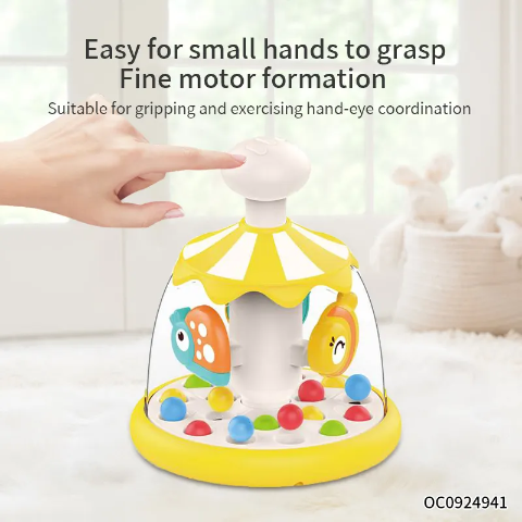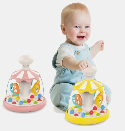 Cu o simplă apăsare în partea superioară, caruselul începe să se rotească, iar animalele simpatice prind viață, captând privirile curioase ale bebelușului.