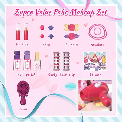 Setul include un uscător de păr funcțional, accesorii de machiaj realist, precum rujuri și oje, toate proiectate pentru siguranța celor mici.
