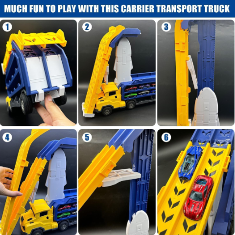 Acest camion impresionant îmbină funcționalitatea unui transportator de mașinuțe cu distracția unui circuit de curse pliabil.
