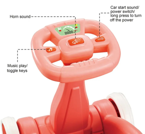 Roțile late asigură stabilitate maximă, iar volanul interactiv cu sunete stimulează simțurile și imaginația.