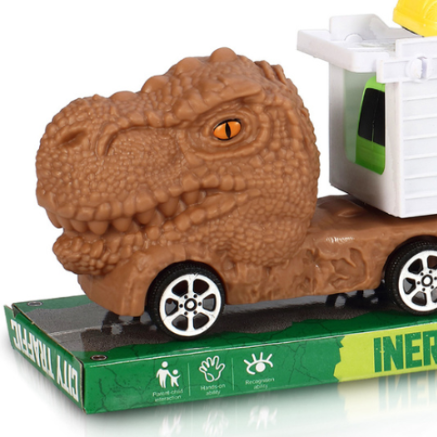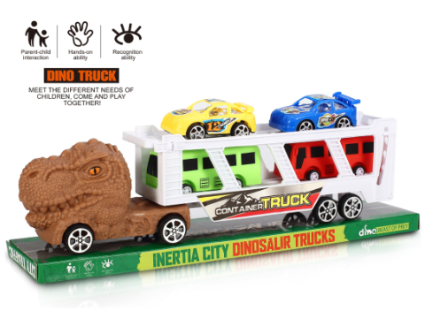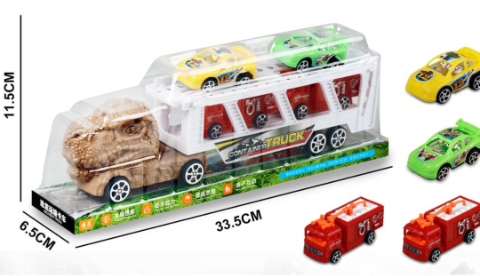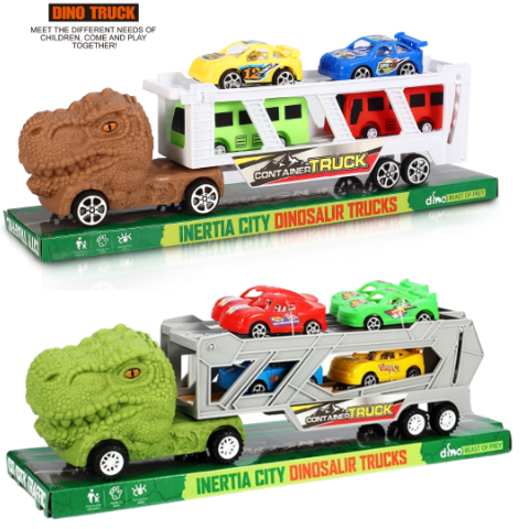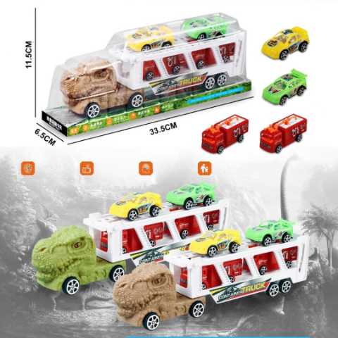 Un camion impresionant, cu un cap de dinozaur realist, pregătit să transporte flota de mașinuțe către o nouă aventură.