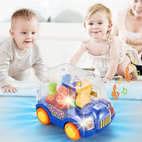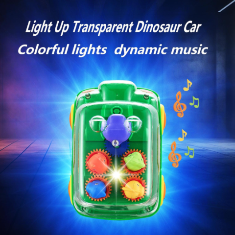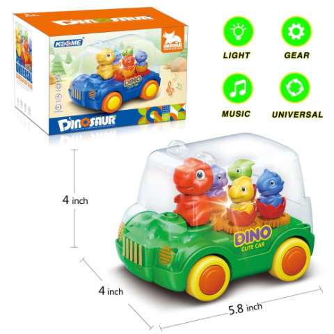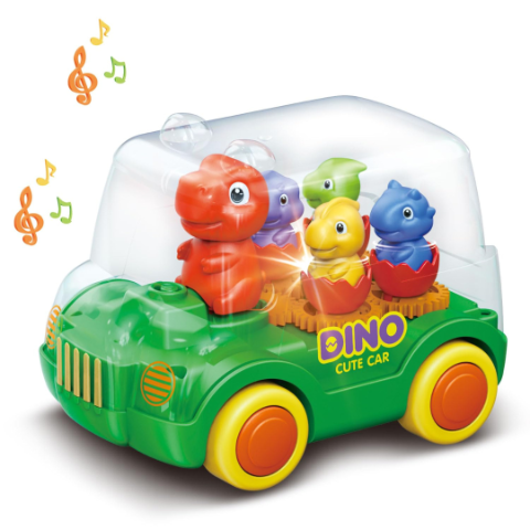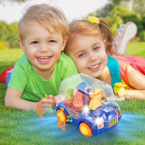 Dinozaurii colorați se învârt pe platformă în timp ce mașinuța se deplasează, iar lumini multicolore și muzica dinamică completează distracția.
