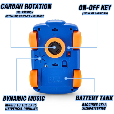 Mașinuța este echipată cu roți cu rotație la 360°, astfel încât evită obstacolele în mod automat.