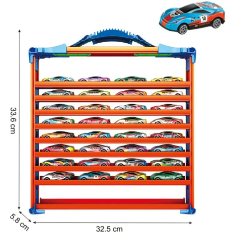 Pista poate stoca până la 36 de mașinuțe, fiind ideală pentru colecționari sau pentru păstrarea ordinii în camera copilului.