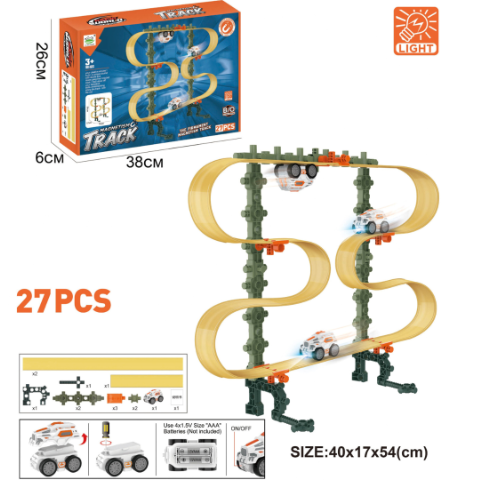 Setul include o mașinuță alimentată de baterii, cu lumini strălucitoare care iluminează traseul în timpul cursei.