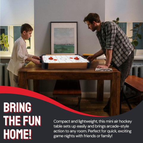 Această masă compactă de Air Hockey este ideală pentru seri de joc în familie sau competiții amicale între prieteni.