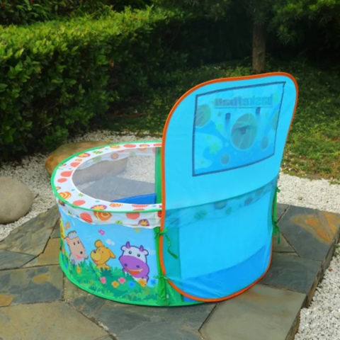 Piscina de joacă este decorată cu culori vii și personaje prietenoase care stimulează imaginația copiilor.