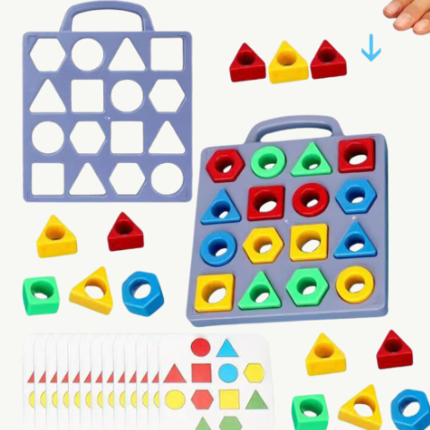 Acest set educațional include un panou cu decupaje și piese geometrice viu colorate, perfecte pentru dezvoltarea abilităților motorii fine.