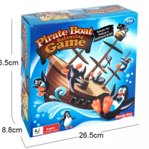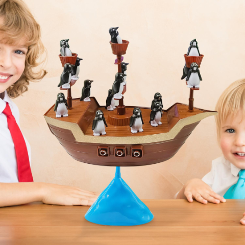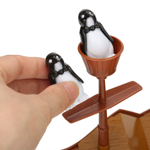Corabia de pirați balansabilă adaugă un plus de suspans, fiecare pinguin plasat aducând barca mai aproape de răsturnare.