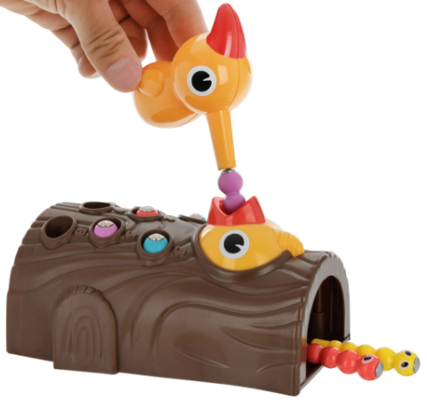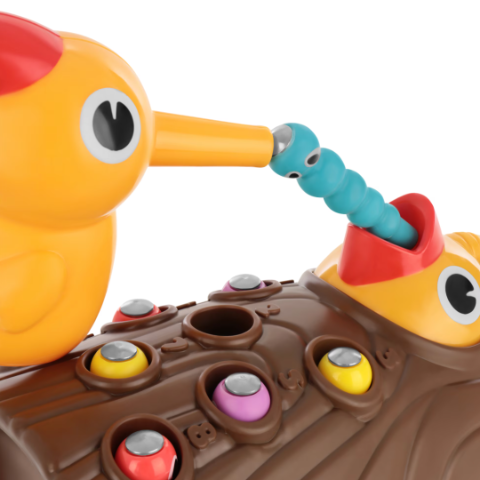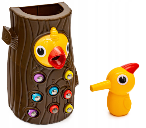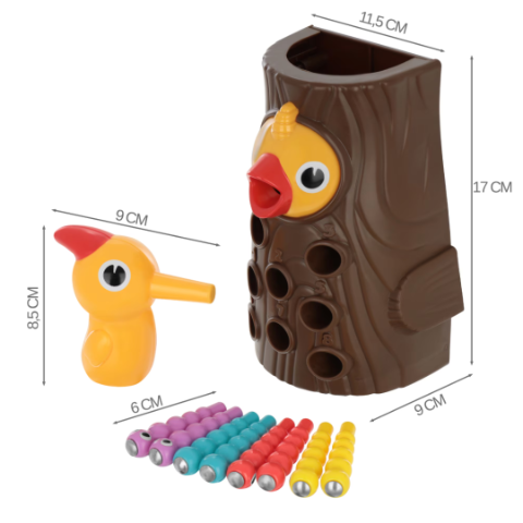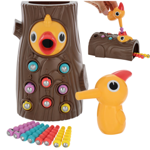 Ciocănitoarea magnetică ușor de manevrat îi ajută pe copii să prindă viermișorii și să îi hrănească pe pui, creând un joc de rol captivant.