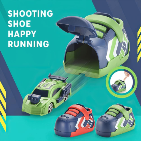 Descoperă o jucărie interactivă care combină distracția curselor de mașinuțe cu un lansator inovator în formă de pantof sport, perfect pentru micii aventurieri.