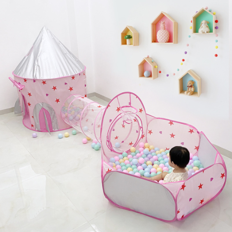 Descoperă un loc de poveste pentru micuțul tău cu acest set de corturi în formă de castel roz, completat cu un tunel de trecere și o piscină de bile care stimulează imaginația și jocul activ.