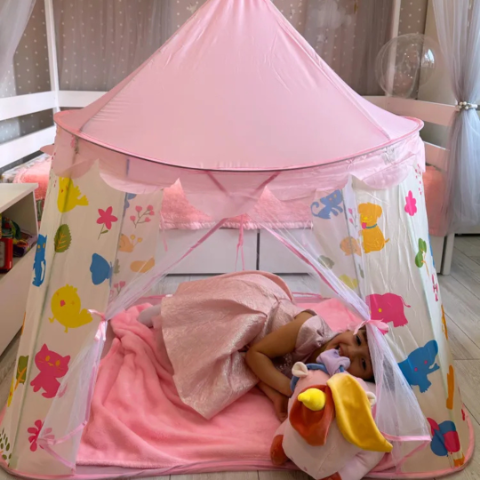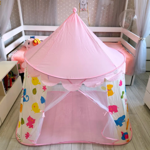 Această căsuță de joacă roz, decorată cu animale vesele și flori colorate, creează un colț de poveste în camera oricărui copil, inspirând imaginația și jocul de rol.