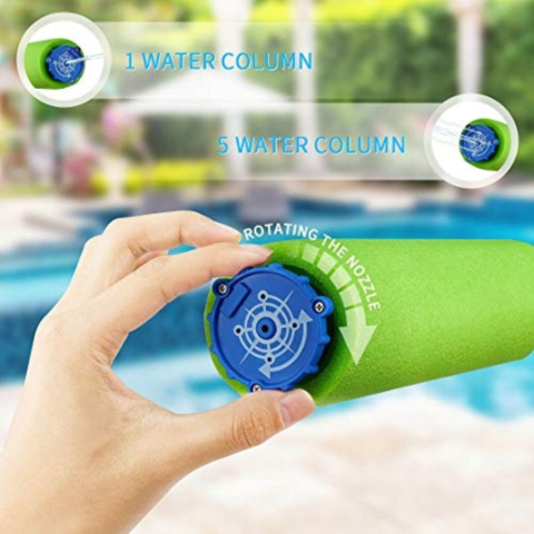 Capătul duzei este reglabil, oferind două opțiuni de pulverizare: un jet concentrat sau cinci jeturi simultane, pentru mai multă varietate și amuzament în joc.