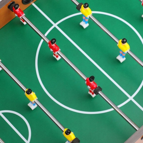 Această masă de fotbal pentru copii aduce toată energia unui meci real în sufrageria ta, cu un design compact și picioare stabile din lemn.