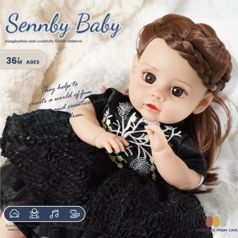 Cu părul castaniu împletit cu grijă și o rochie elegantă de culoare neagră, păpușa inspiră rafinament și imaginație.