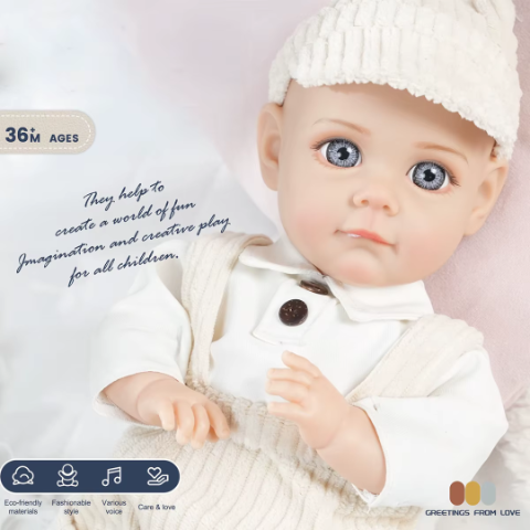 Această adorabilă păpușă Reborn băiețel captează imediat atenția cu ochii albaștri expresivi și trăsături faciale realiste, oferind copiilor o experiență de joacă autentică.
