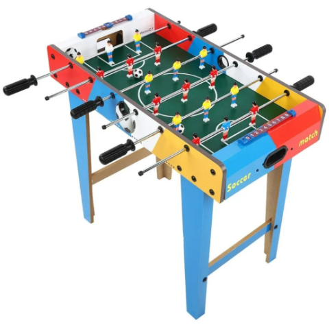 Această masă de fotbal de jucărie aduce un strop de energie în orice cameră de joacă, cu designul său viu colorat și dimensiunile compacte, ideale pentru copii.