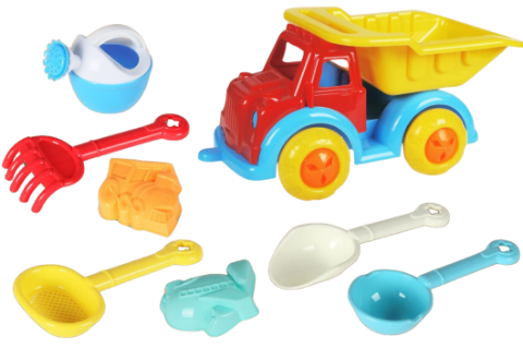 Setul include camion basculant, o greblă, o sită, două lopeți, o lingură adâncă, o stropitoare și două forme de construit – una în formă de avion și cealaltă în formă de tren.