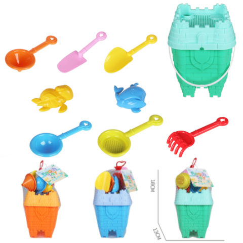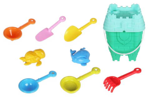 Setul include o găletușă, o greblă, o sită, lingurițe și lopeți, și 2 forme în formă broască țestoasă și balenă – toate realizate din plastic rezistent, netoxic, și în culori atractive.