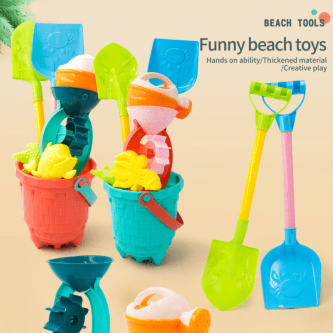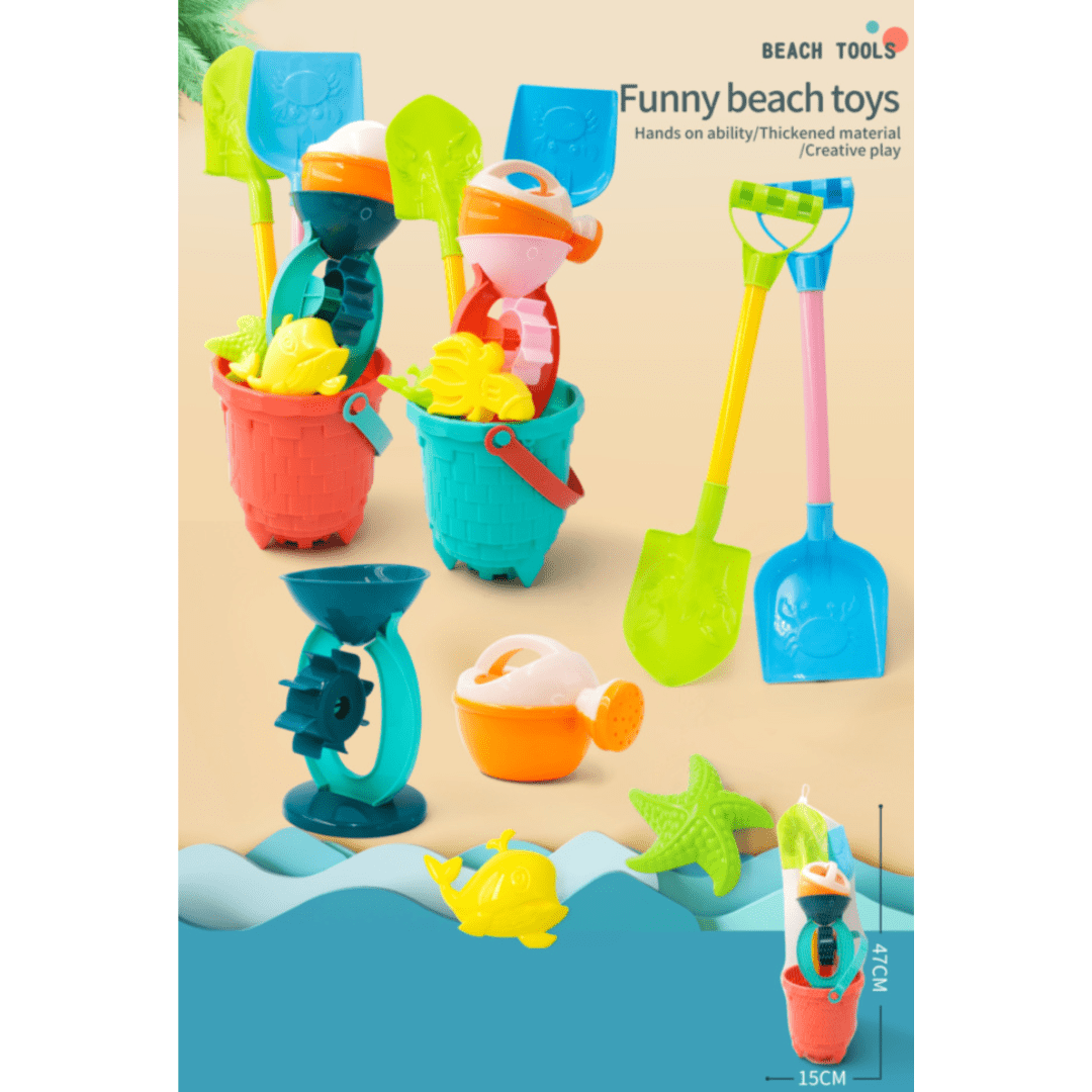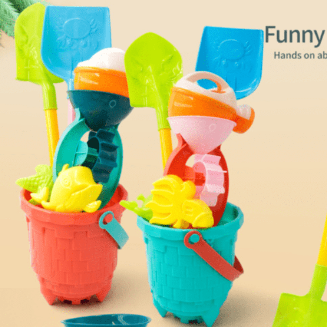 Setul de plajă vine într-o găletușă texturată, cu design tip împletitură, plină de accesorii colorate pentru ore nesfârșite de distracție în nisip.