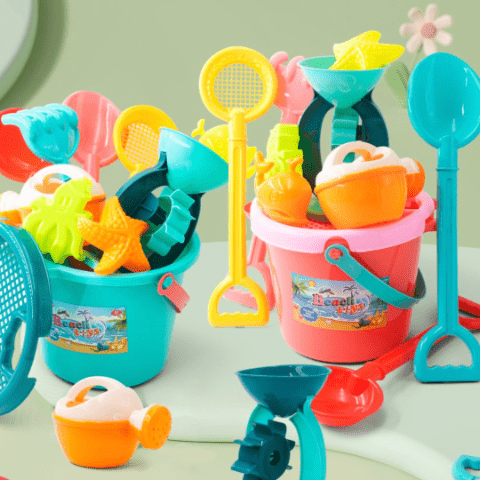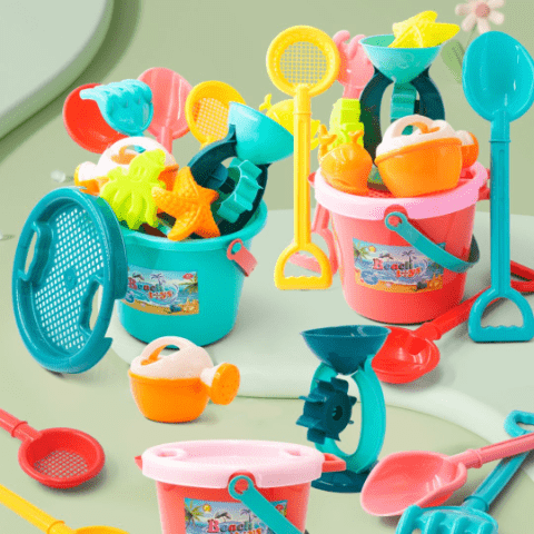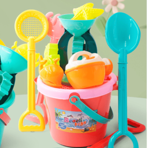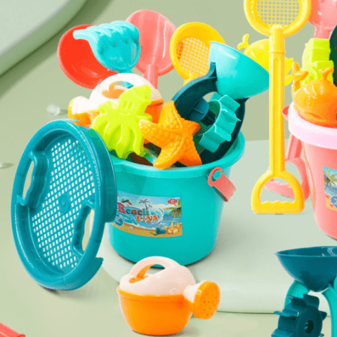 Setul include găletușe colorate cu ustensile și accesorii viu colorate, ideale pentru distracție în aer liber.