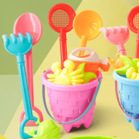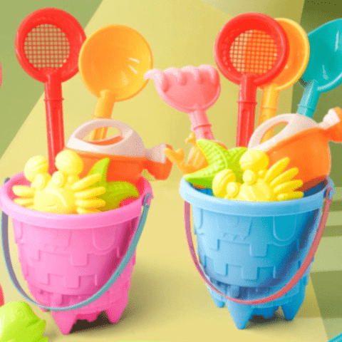Ustensilele de diferite dimensiuni îi încurajează pe copii să construiască, să sape și să creeze.