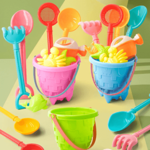Găletușele roz și albastre, cu design texturat și culori vesele, sunt dotate cu lopeți, greble și site pentru joacă activă.