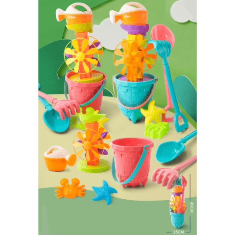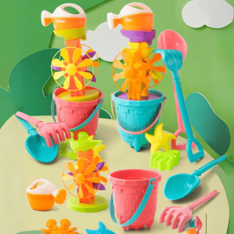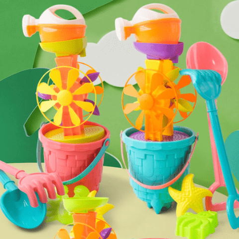 Lopețile, grebla și formele de crab, stea sau delfin invită copiii să construiască, să sape și să creeze lumi imaginare.