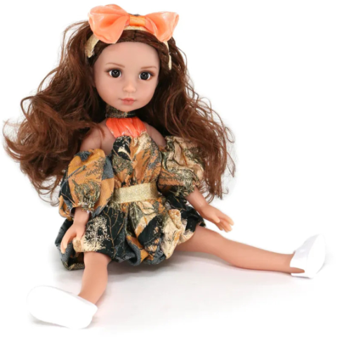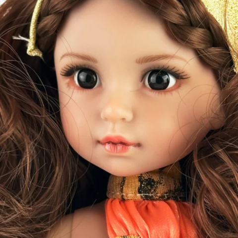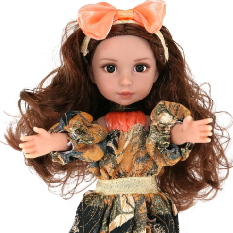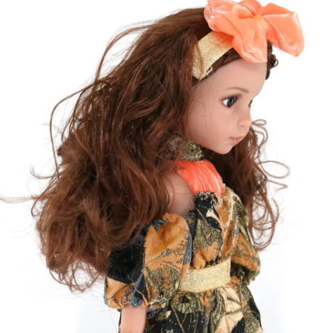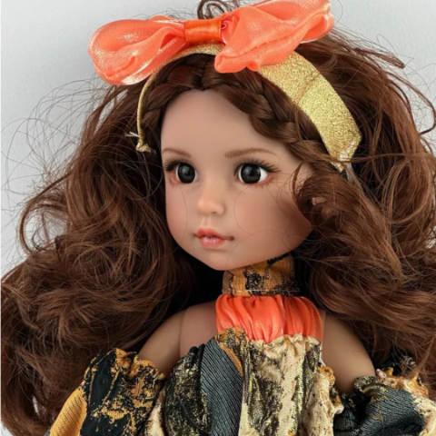 Această păpușă colecționabilă impresionează prin trăsăturile delicate ale feței și părul bogat, ondulat, cu o fundă portocalie care adaugă un accent jucăuș.