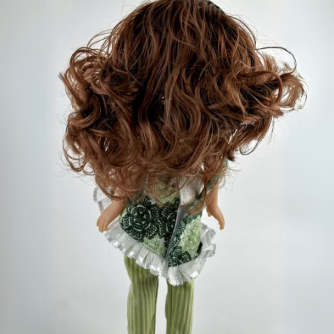Privită din spate, părul des și bine structurat reflectă calitatea acestei jucării atent lucrate.