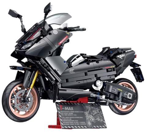 Designul realist al motocicletei T-MAX include detalii autentice precum suspensii, motor și ghidon mobil, inspirând imaginația și dezvoltarea abilităților tehnice.
