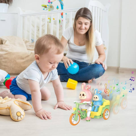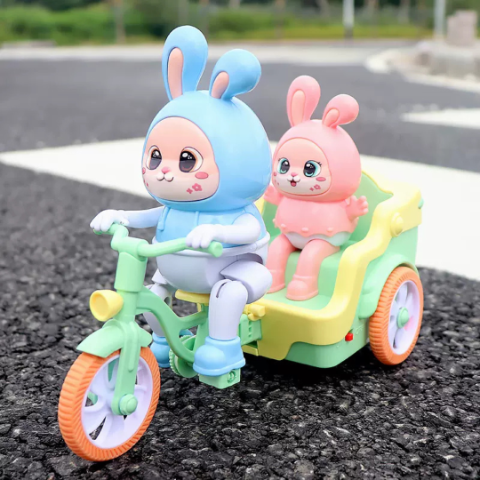Jucăria adorabilă Funny Rabbit aduce doi iepurași colorați care pornesc într-o aventură veselă pe tricicletă.